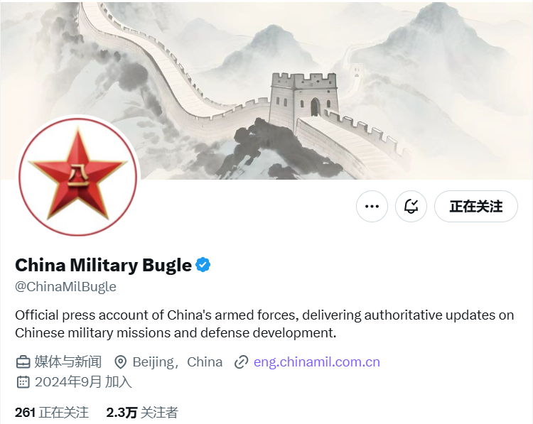Under the name of "China Military Bugle" (handle: @ChinaMilBugle), the accounts debuted on X in September 2024 and later expanded to Facebook, Instagram and YouTube.