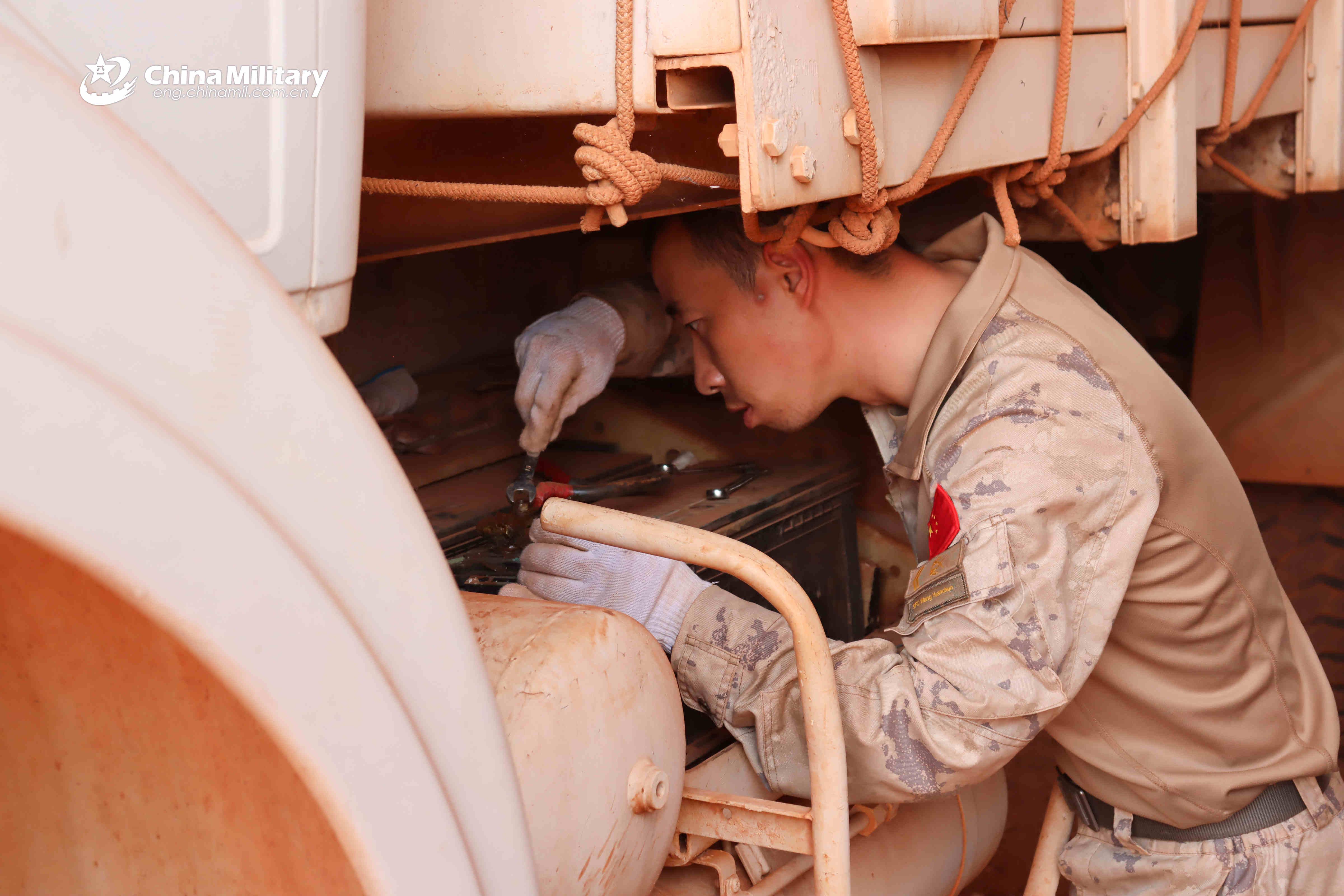 A Chinese peacekeeping engineer demonstrates equipment maintenance on site. (eng.chinamil.com.cn/Photo by Gao Junwei and Miao Changhao)