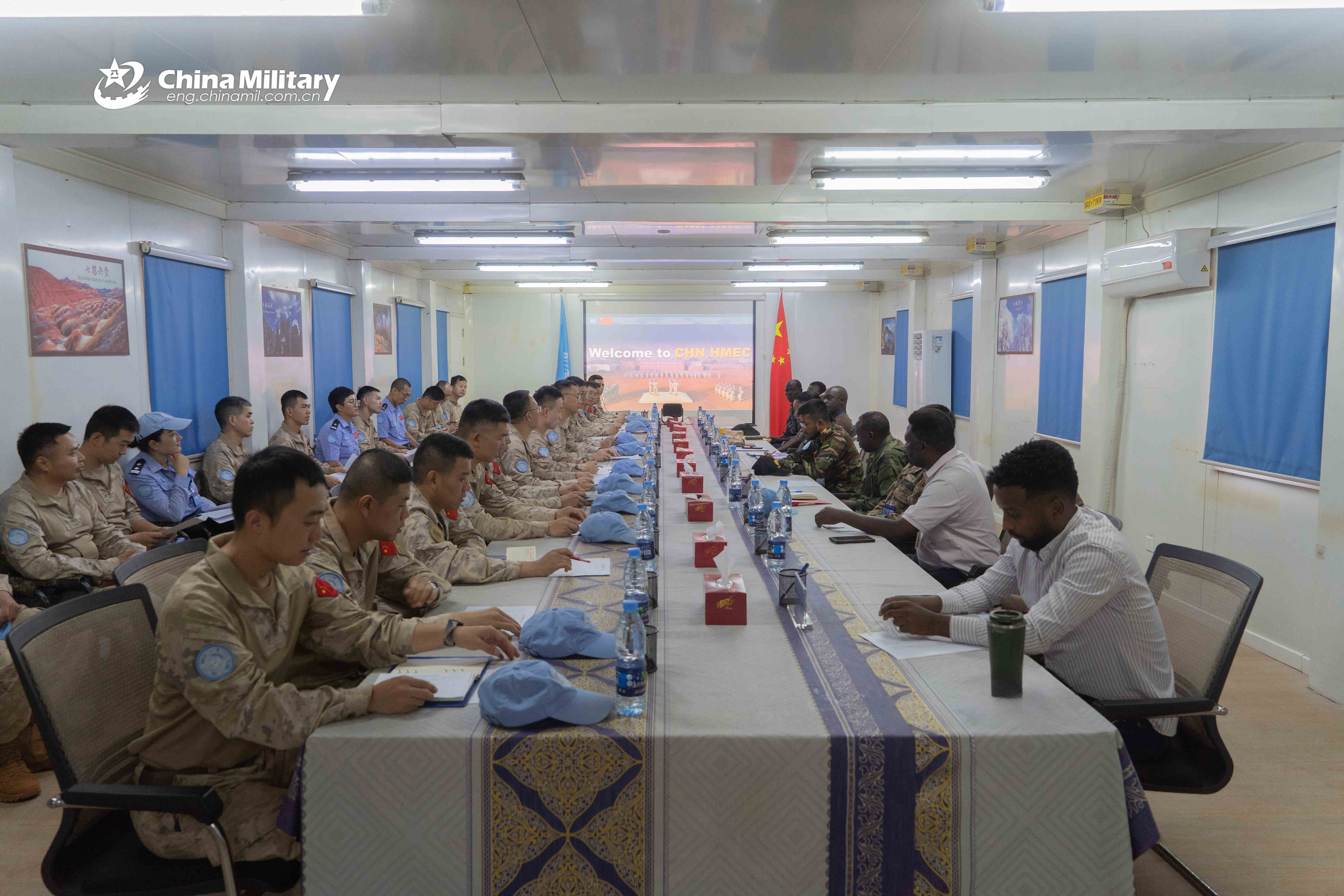 Inspection personnel listen to a briefing by the Chinese peacekeeping force. (eng.chinamil.com.cn/Photo by Gao Junwei and Miao Changhao)