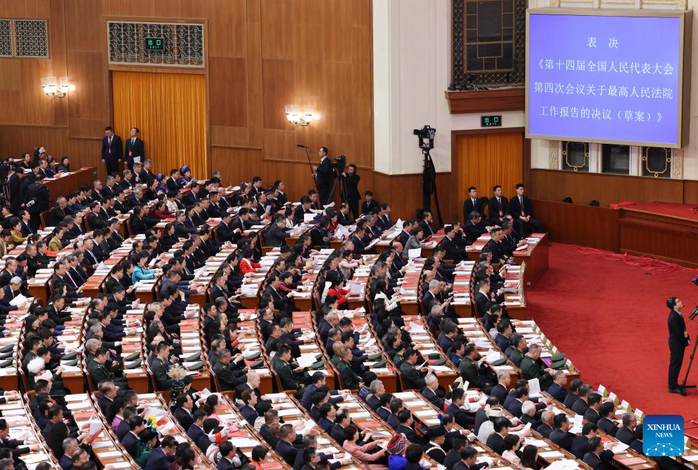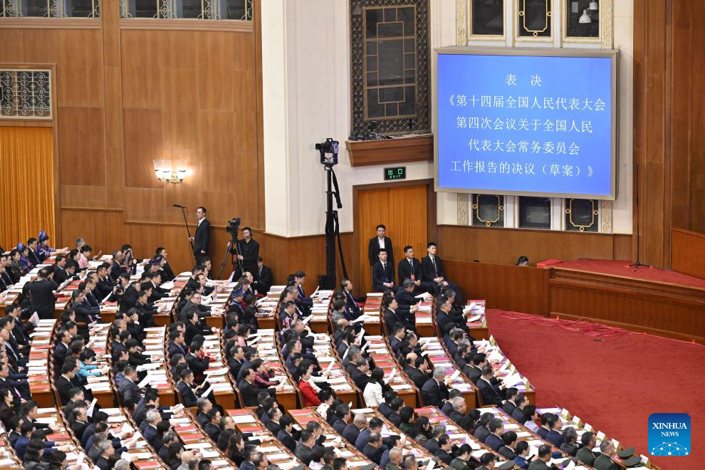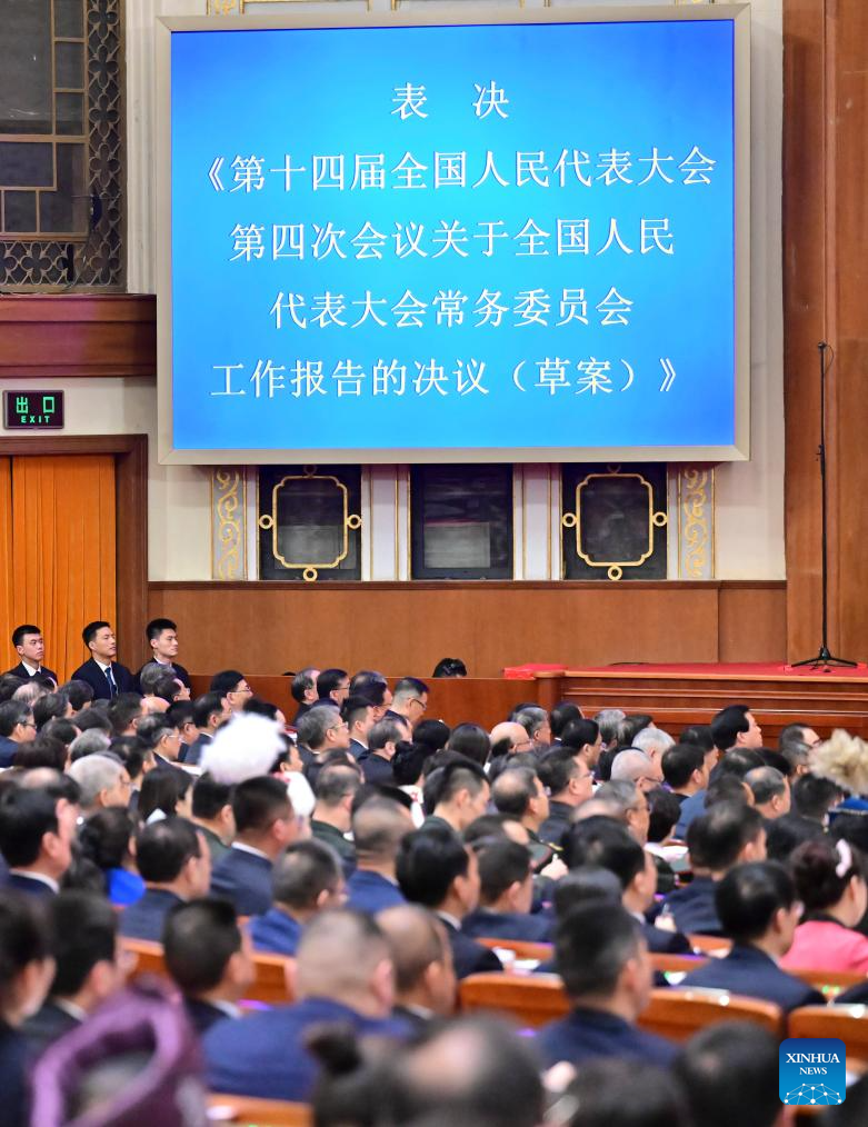 Lawmakers voted to adopt a resolution on the work report of the NPC Standing Committee, a resolution on the work report of the Supreme People's Court, and a resolution on the work report of the Supreme People's Procuratorate.