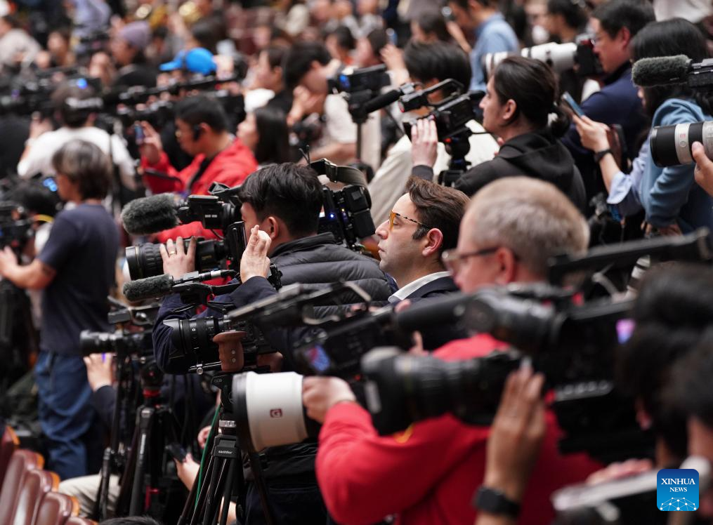 Journalists work at the closing meeting of the fourth session of the 14th National People's Congress (NPC) at the Great Hall of the People in Beijing, capital of China, March 12, 2026. (Xinhua/Fu Tian)