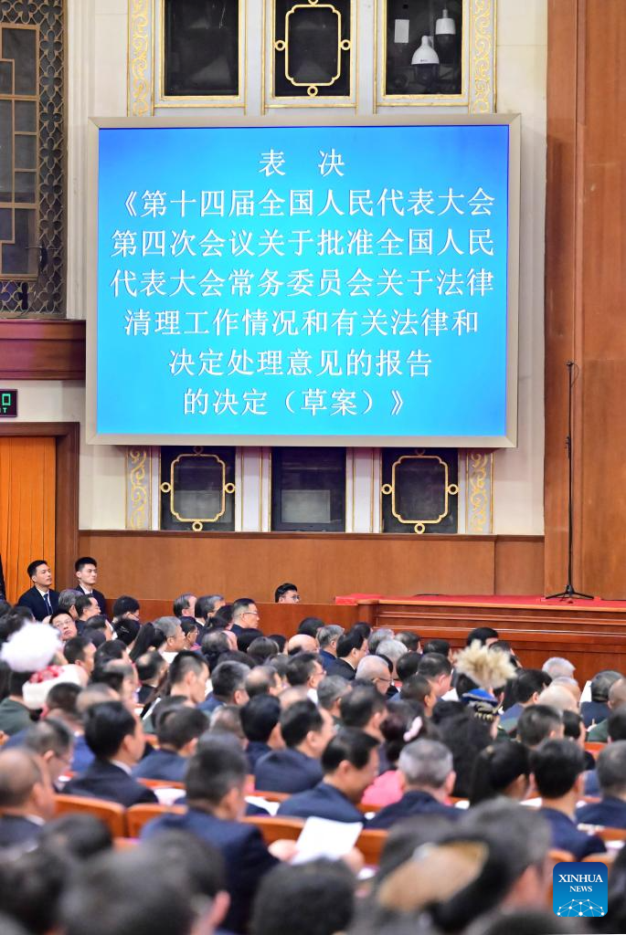They also voted to adopt a decision on approving the report of the NPC Standing Committee on the work of the overhaul of laws and the proposed handling of certain laws and decisions.