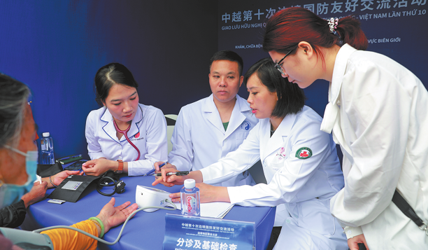 Military doctors from China and Vietnam collaborate to assess a patient's health on Tuesday during voluntary medical consultations in Dongxing, Guangxi Zhuang autonomous region. The four-hour camp was held both in Dongxing and Vietnam's Quang Ninh province. ZHANG ZIYI/FOR CHINA DAILY