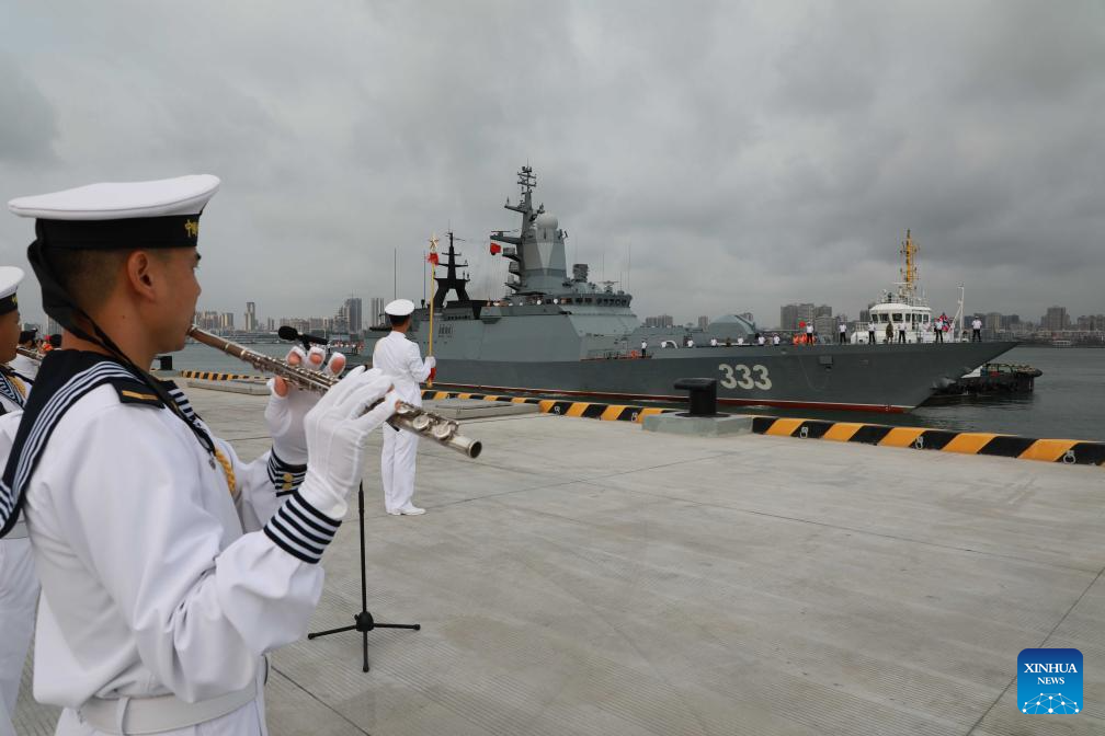 The Russian fleet, flying the flags of both Russia and China, docked on Wednesday morning at a military port in Zhanjiang, where the Chinese side held a welcome ceremony. (Xinhua/Mi Siyuan)
