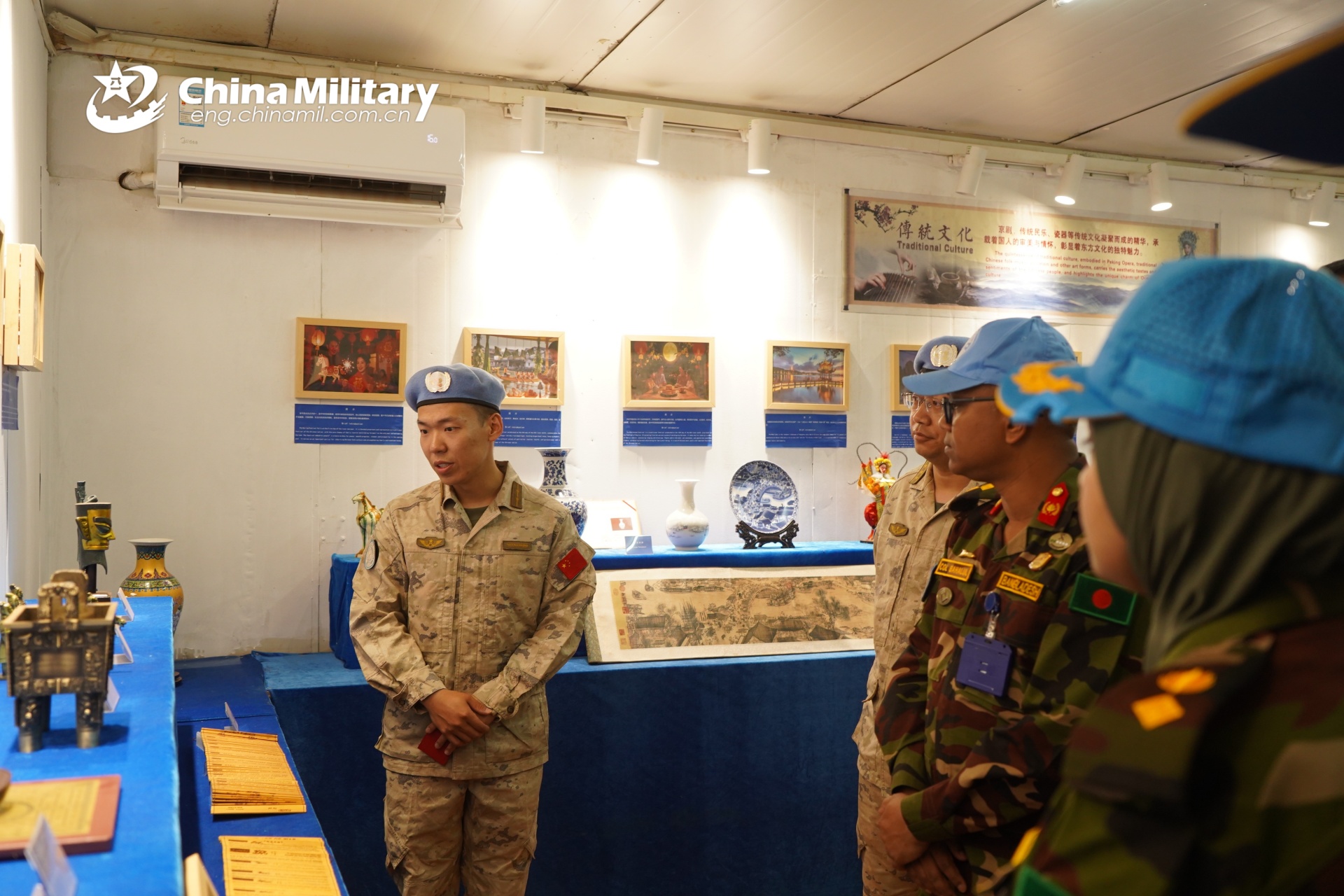 A Chinese peacekeeper introduces the copy of a Chinese cultural relic.