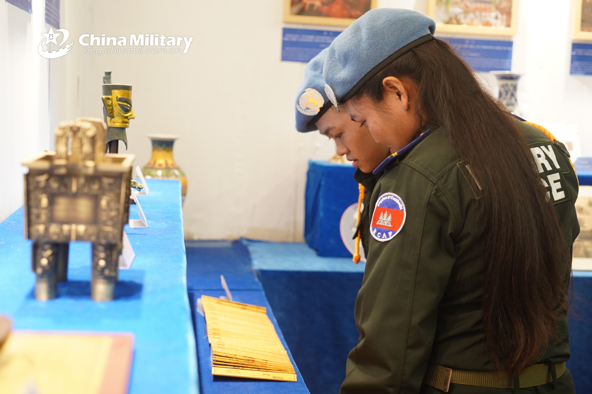 Cambodian peacekeeping policeman and policewoman observe the copy of a Chinese cultural relic.