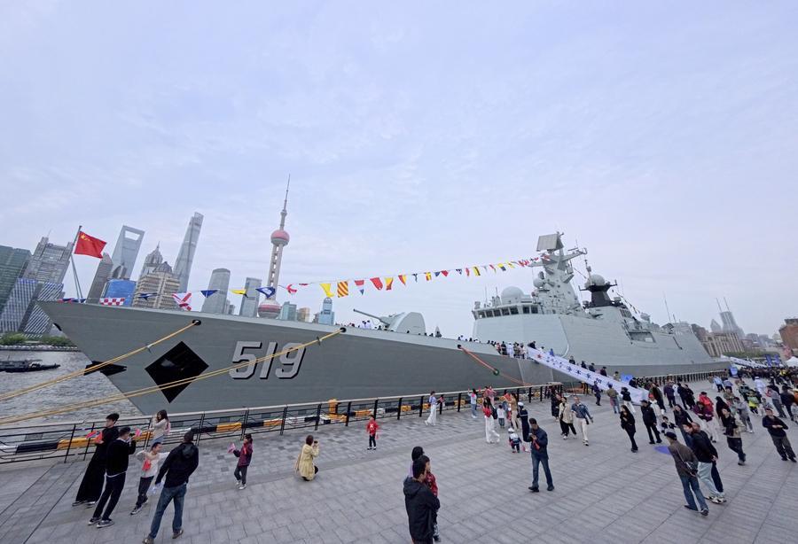 This photo taken on April 21, 2026 shows Chinese People's Liberation Army (PLA) Navy ship Fuyang mooring at a port in east China's Shanghai. (Xinhua/Fang Zhe)
