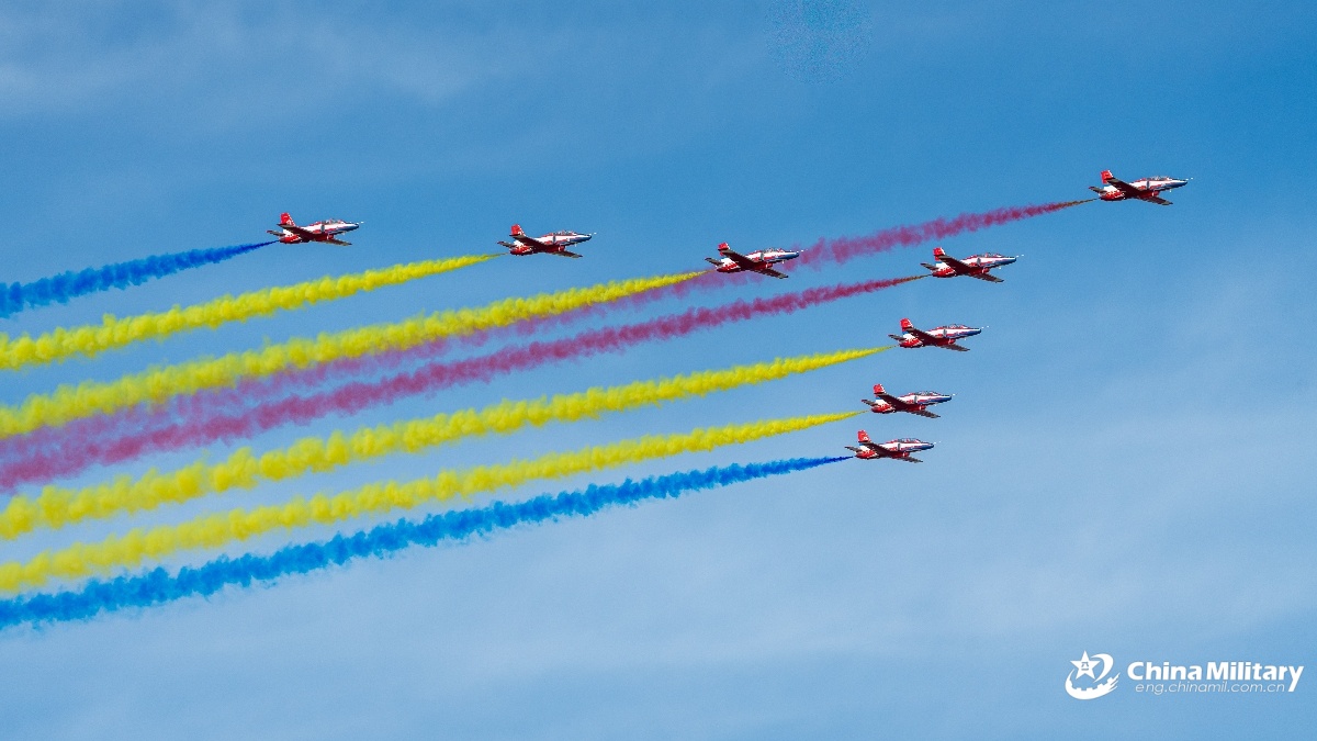K-8 mediate trainer jets attached to the Red Falcon Aerobatic Team of the Aviation University of the Chinese PLA Air Force emit colored smoke during the 2025 aviation open-day activities of the Chinese PLA Air Force and Changchun Air Show in Changchun City, northeast China's Jilin Province. (eng.chinamil.com.cn/Photo by Chen Jieying)