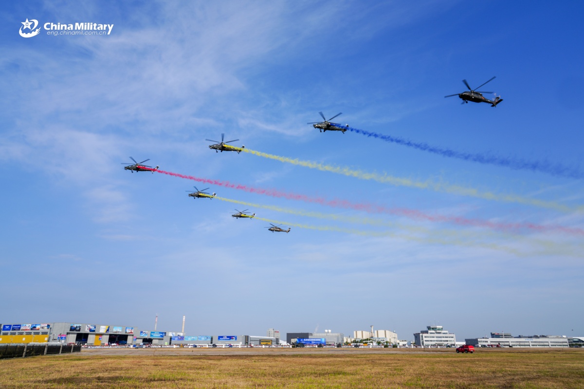 Z-10 attack helicopters and Z-20 utility helicopters attached to the Chinese PLA Army's Thunder Aerobatic Team fly in arrow formation during the 7th China Helicopter Exposition . (eng.chinamil.com.cn/Photo by Luan Cheng)