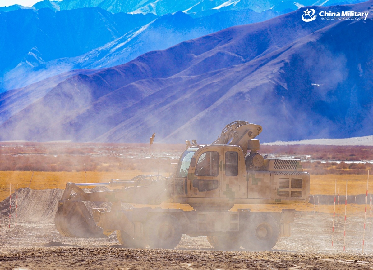 An engineer soldier assigned to a regiment under the Chinese PLA Xinjiang Military Command operates an excavator to complete training subjects during a training exercise on October 14, 2025. (eng.chinamil.com.cn/Photo by Liu Fasen)