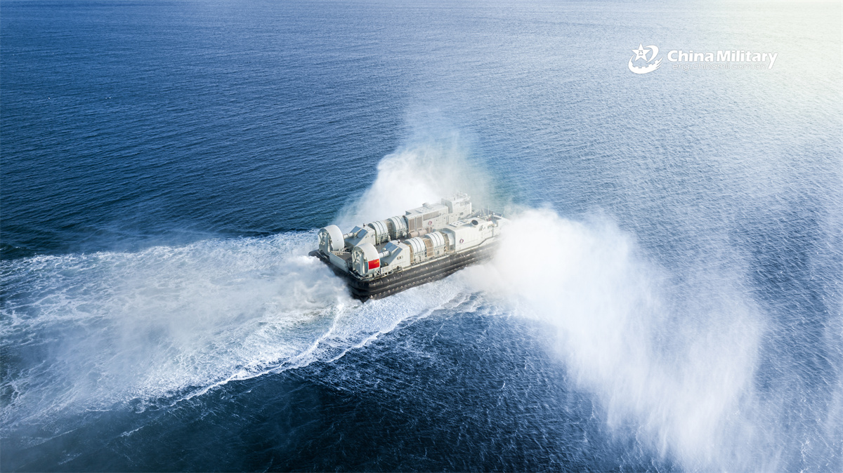 A landing craft air cushion (LCAC) attached to a landing ship group under the Chinese PLA Navy steams to the beach-head at lightning speed during a maritime training exercise on October 14, 2025. (eng.chinamil.com.cn/ Photo by Zhang Xueyan)