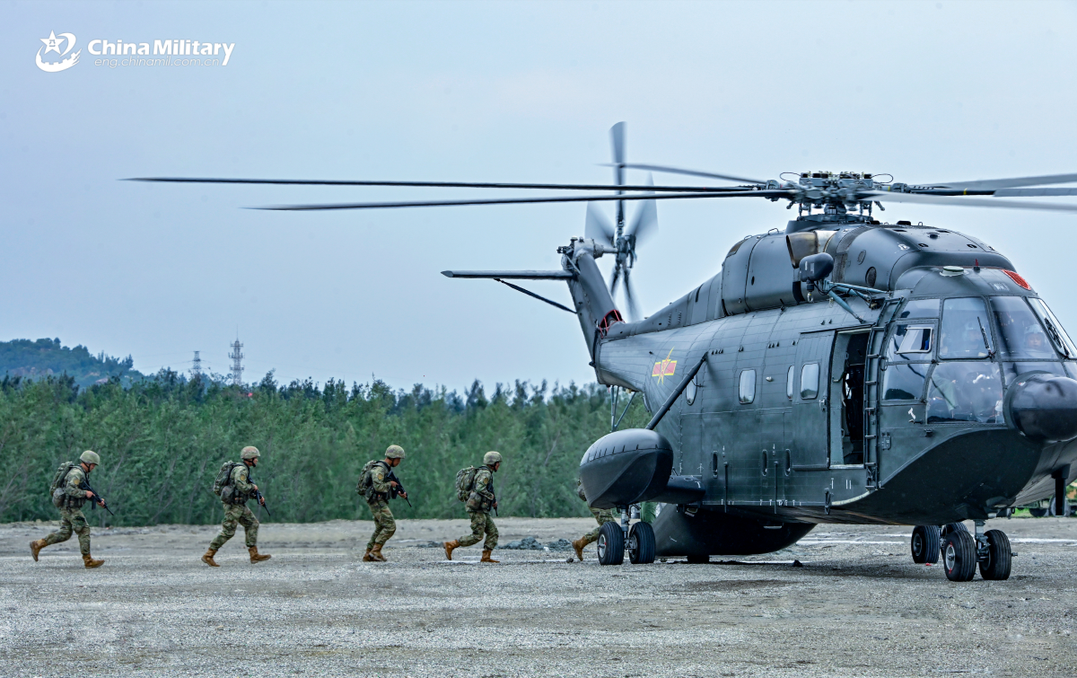 Assault troops assigned to a brigade under the Chinese PLA Eastern Theater Command file into a Z-8 transport helicopter during a multi-subject flight training exercise on September 12, 2025. (eng.chinamil.com.cn/Photo by Zhang Mao)