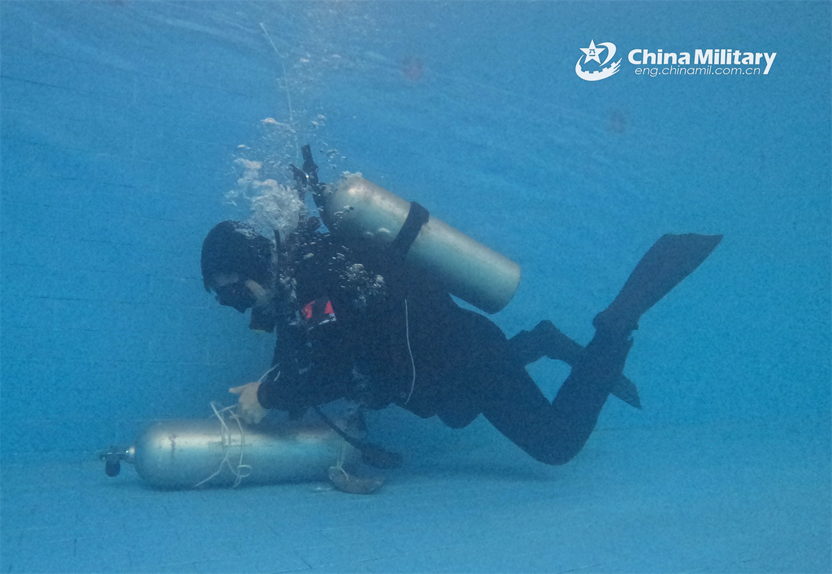 A diver assigned to a unit of the navy under the Chinese PLA Southern Theater Command carries out underwater salvage training during a comprehensive underwater training exercise in recent days. (eng.chinamil.com.cn/Photo by Peng Jun)