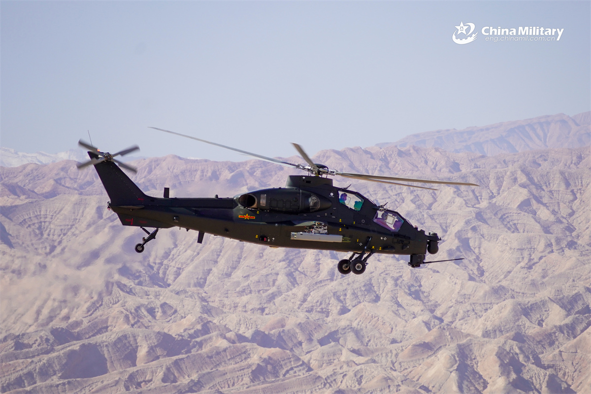 A Z-10 attack helicopter attached to a brigade under the Chinese PLA Xinjiang Military Command maneuvers to the designated area during a live-fire training exercise on October 18, 2025. (eng.chinamil.com.cn/Photo by Ji Jiantao)