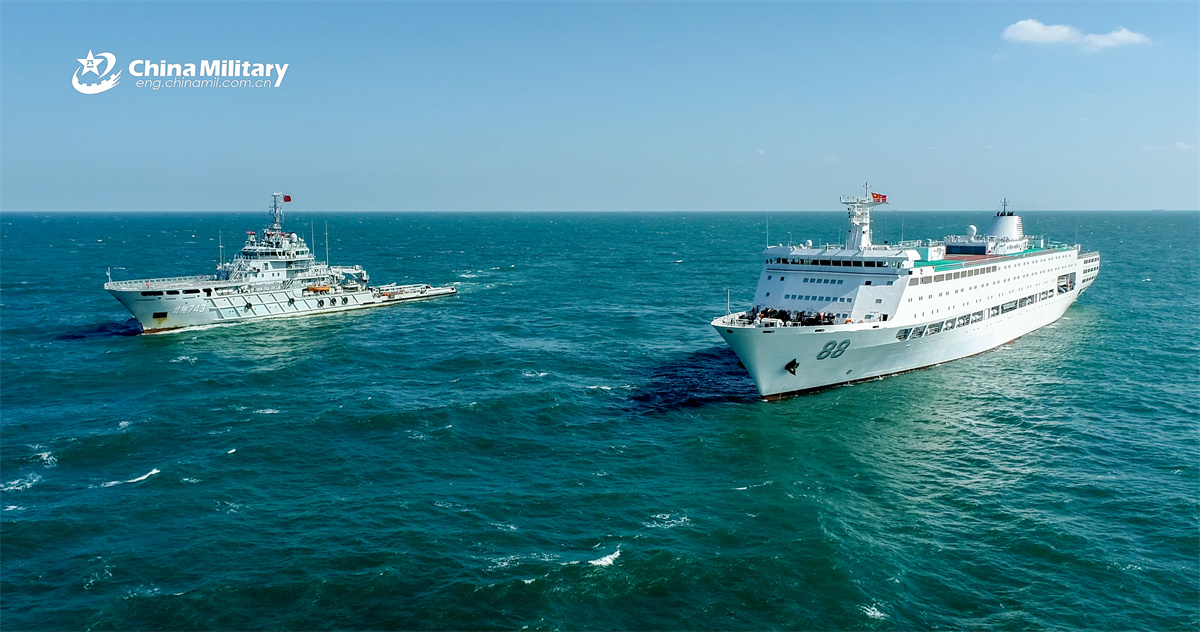 A support ship (Hull 88) and an ocean towage tug (Hull 743) attached to a combat support ship flotilla with the navy under the Chinese PLA Northern Theater Command sail in formation during an ocean towing and salvage training exercise in early November, 2025. (eng.chinamil.com.cn/Photo by Zhou Yuanzhi)
