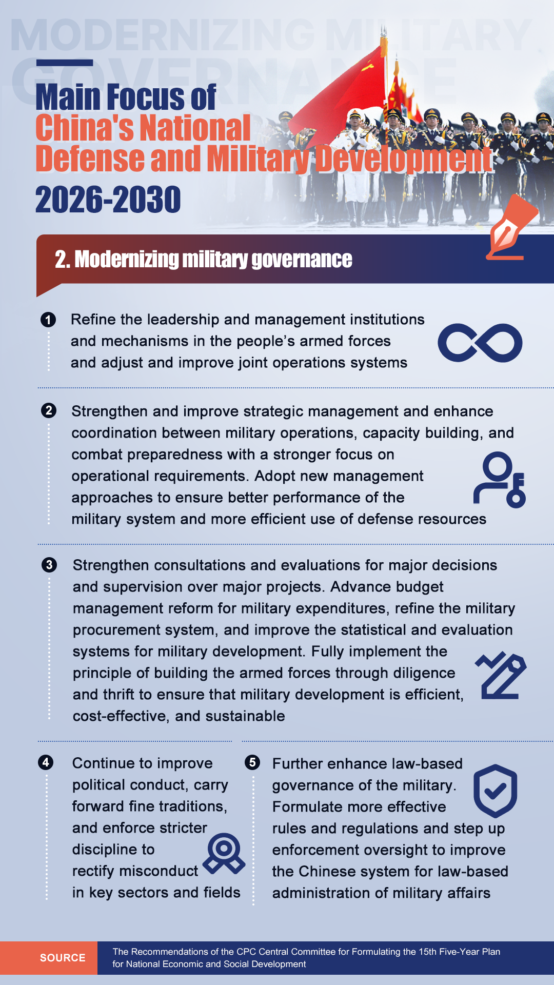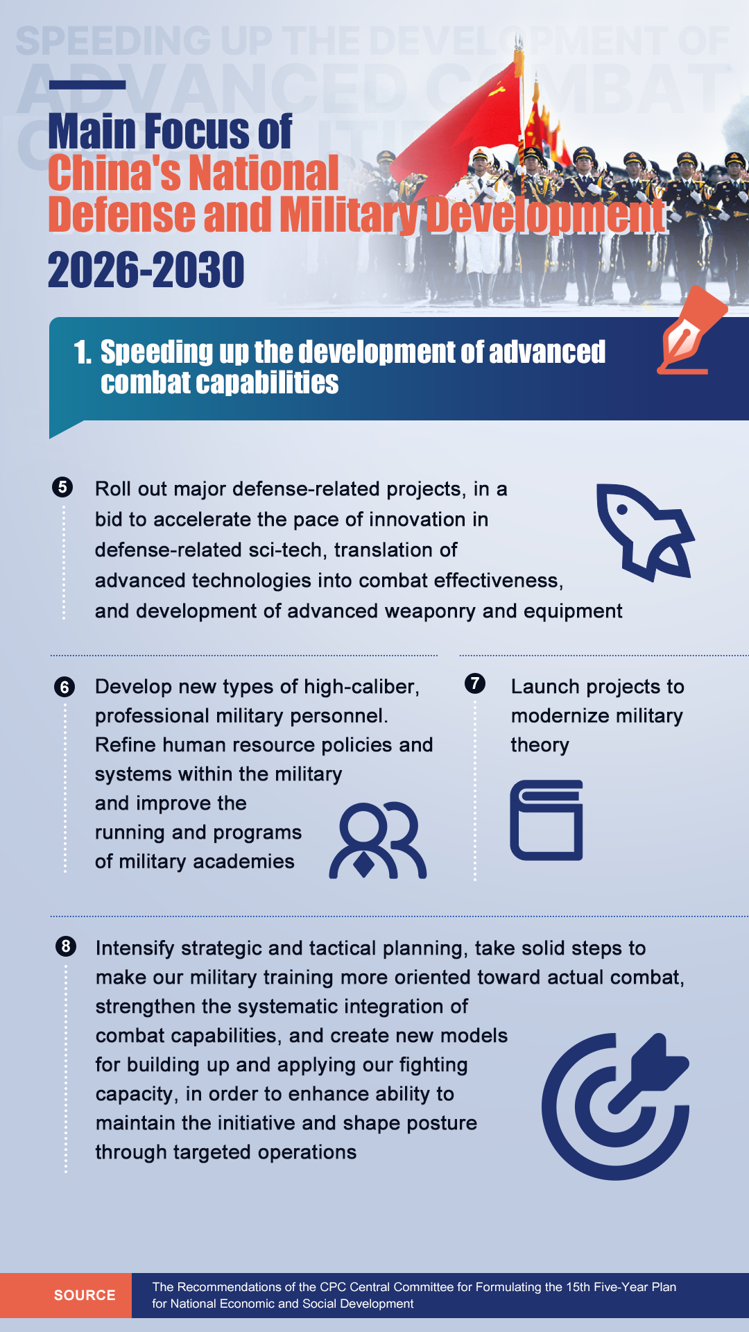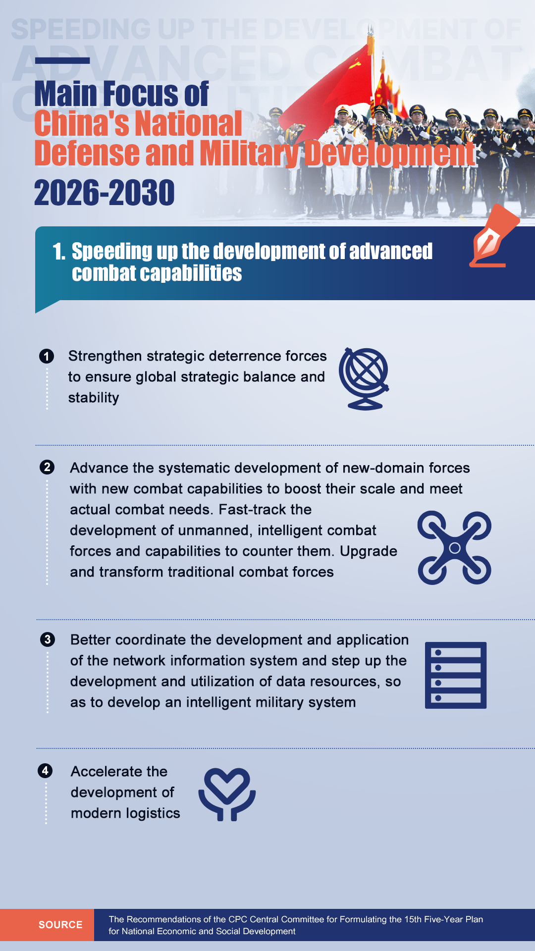 According to the document, China's national defense and military development will focus on several key areas. Check out the infographic below for a breakdown of those key areas from 2026 to 2030.