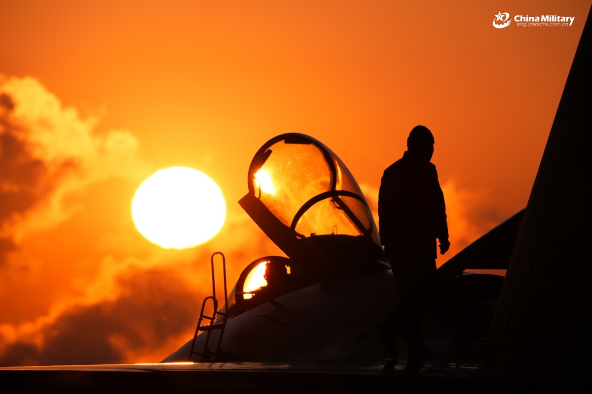 A maintenance man assigned to a unit under the Chinese PLA Air Force checks the fighter jet during a flight training exercise. (eng.chinamil.com.cn/Photo by Yu Zeqi)