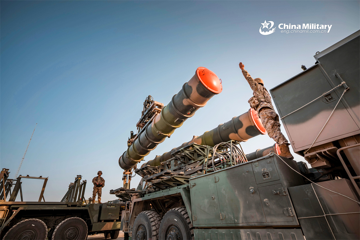 Soldiers assigned to a unit under the Chinese PLA Air Force hoist and load the HQ-9 surface-to-air missile system onto the missile launching vehicle during a multi-subject training exercise in early January, 2026. (eng.chinamil.com.cn/Photo by Chen Yi)