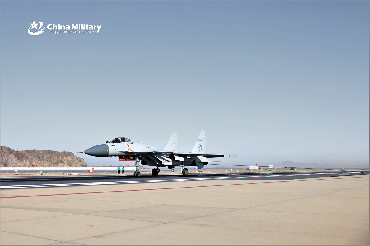 A J-15 carrier-based fighter jet attached to the Chinese PLA Naval Aviation University catches the arresting gear wire during an arrested landing training exercise. (eng.chinamil.com.cn/Photo by Sun Hongqiang)