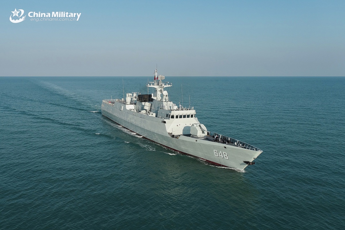 The guided-missile corvette Hanzhong (Hull 648) attached to a frigate flotilla under the PLA Southern Theater Command maneuvers toward the target sea area during a maritime training exercise in mid-January, 2026. (eng.chinamil.com.cn/Photo by Zhang bin)