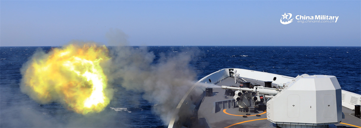 The Type 054A guided-missile frigate Chenzhou (Hull 552) attached to a naval flotilla under the Chinese PLA Southern Theater Command fires its main gun at the mock sea targets during a multi-subject training exercise. (eng.chinamil.com.cn/Photo by Wang Chunguang)