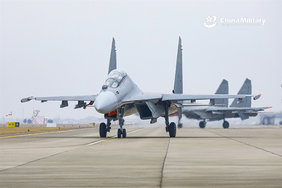J-16 fighter jets attached to a unit under the Chinese PLA Air Force taxi on the runway prior to a flight training exercise in early February, 2026. (eng.chinamil.com.cn/Photo by Zheng Hanyi)