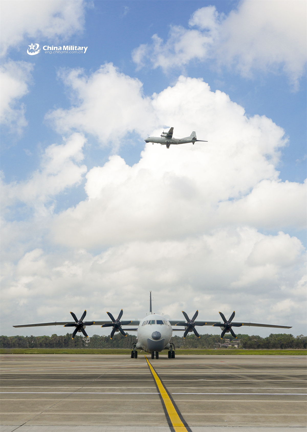 A Y-8 anti-submarine patrol aircraft attached to an aviation regiment under the Chinese PLA Navy taxies on the runway while another soars into the sky during a flight training exercise in late March, 2026. (eng.chinamil.com.cn/Photo by Qin Qianjiang)