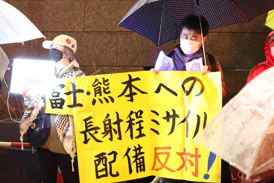 Residents stage a protest against Japanese government's deployment of long-range missiles with counterstrike capabilities in Kumamoto Prefecture and Shizuoka Prefecture, in Tokyo, Japan, on March 31, 2026. (Xinhua/Yue Chenxing)