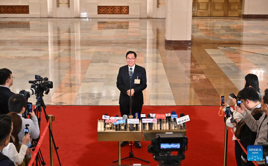 Chinese Minister of Industry and Information Technology Li Lecheng gives an interview after the opening meeting of the fourth session of the 14th National People's Congress (NPC) at the Great Hall of the People in Beijing, capital of China, March 5, 2026. (Xinhua/Wang Xi)
