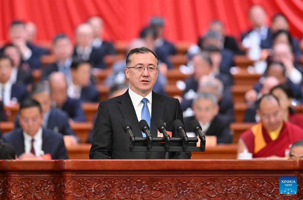 Ilzat Ahmatjan, a member of the 14th National Committee of the Chinese People's Political Consultative Conference (CPPCC), speaks at the third plenary meeting of the fourth session of the 14th CPPCC National Committee at the Great Hall of the People in Beijing, capital of China, March 8, 2026. (Xinhua/Zhang Ling)