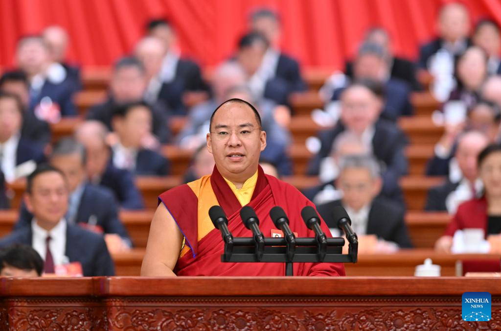 Panchen Erdeni Chos-kyi rGyal-po, a member of the 14th National Committee of the Chinese People's Political Consultative Conference (CPPCC), speaks at the third plenary meeting of the fourth session of the 14th CPPCC National Committee at the Great Hall of the People in Beijing, capital of China, March 8, 2026. (Xinhua/Yue Yuewei)