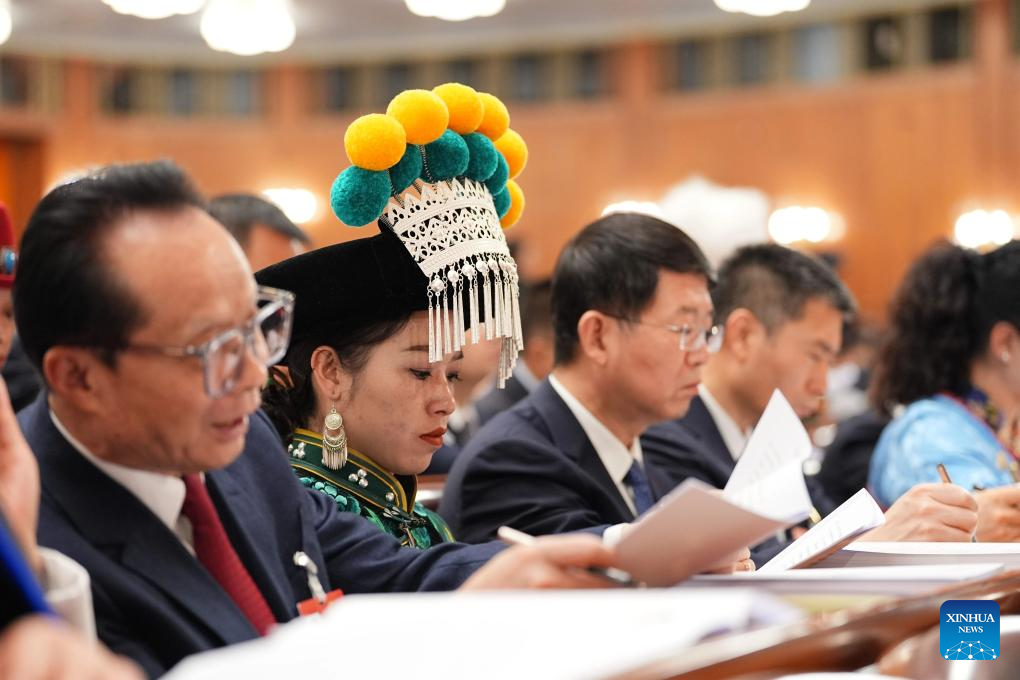 Jin Ruirui (2nd L), a deputy to the 14th National People's Congress (NPC), attends the opening meeting of the fourth session of the 14th NPC at the Great Hall of the People in Beijing, capital of China, March 5, 2026.