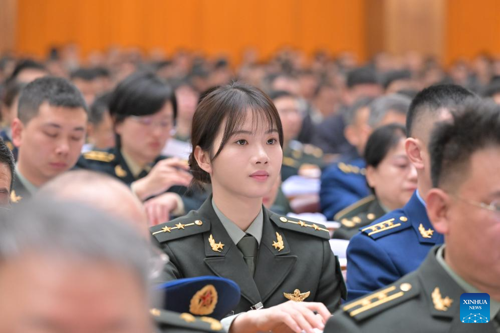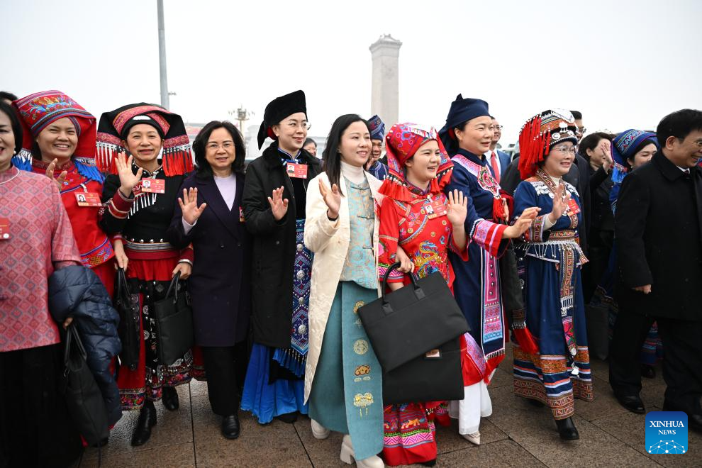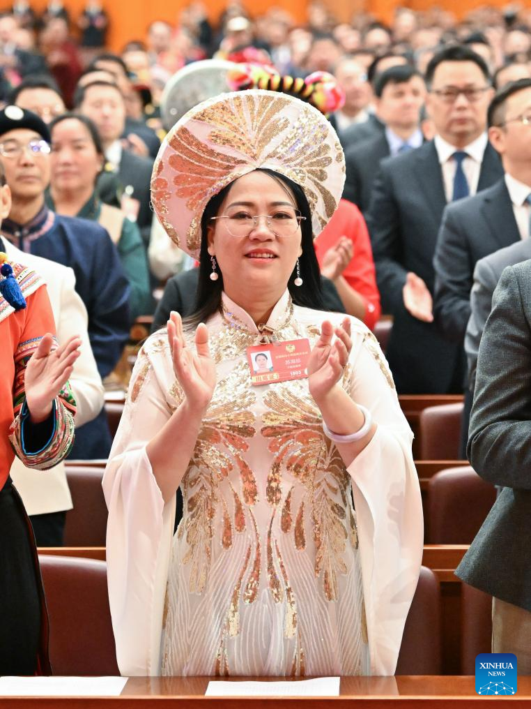 Zhang Qiongli (2nd R, front), a deputy to the 14th National People's Congress (NPC), attends the opening meeting of the fourth session of the 14th NPC at the Great Hall of the People in Beijing, capital of China, March 5, 2026.