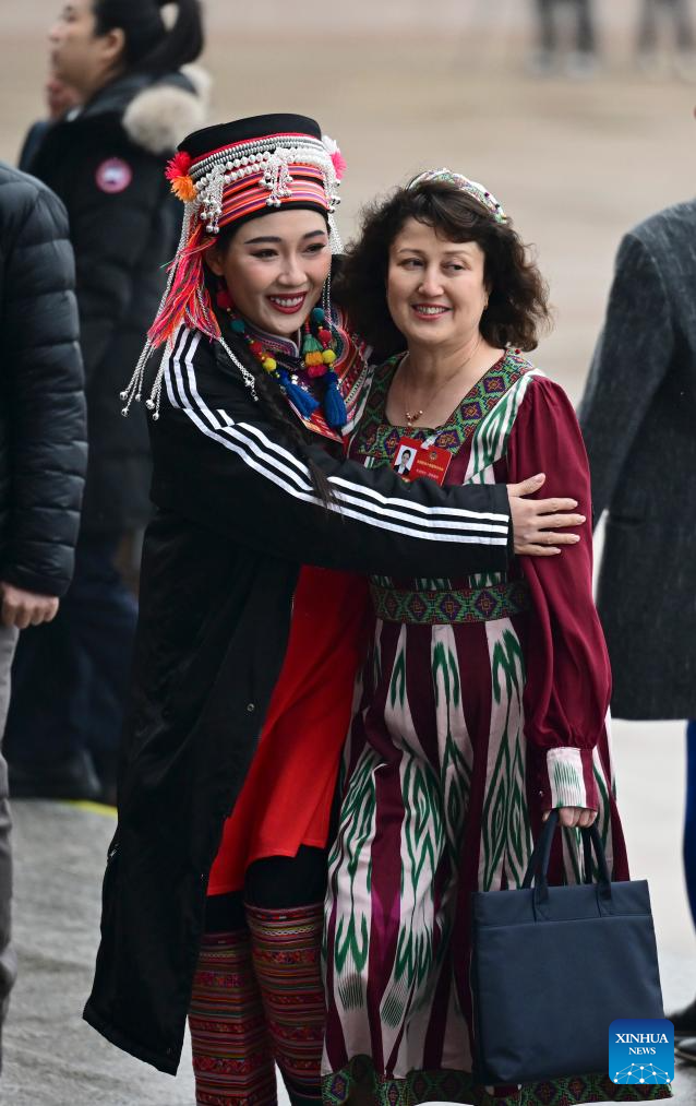 Yang Yuni (L) and Muhtabar Abdolla, members of the 14th National Committee of the Chinese People's Political Consultative Conference (CPPCC), walk towards the Great Hall of the People for the opening meeting of the fourth session of the 14th CPPCC National Committee in Beijing, capital of China, March 4, 2026.