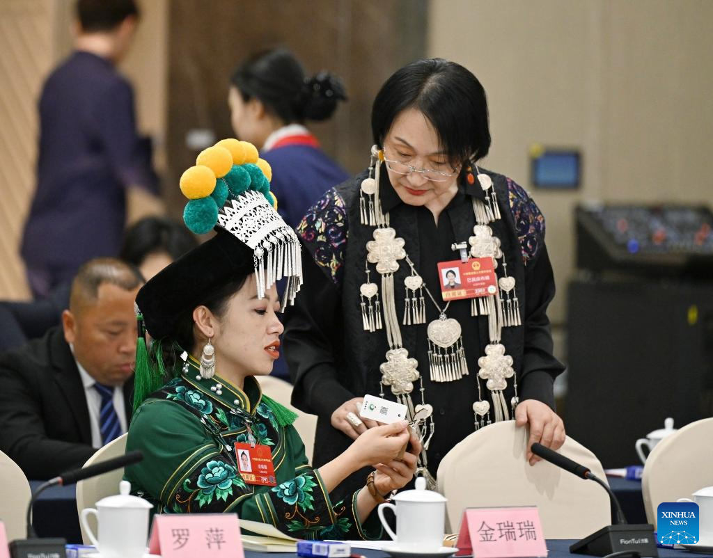 Jin Ruirui (L, front), a deputy to the 14th National People's Congress (NPC), talks with another lawmaker before a group meeting of deputies from the delegation of Yunnan Province at the fourth session of the 14th NPC in Beijing, capital of China, March 7, 2026.