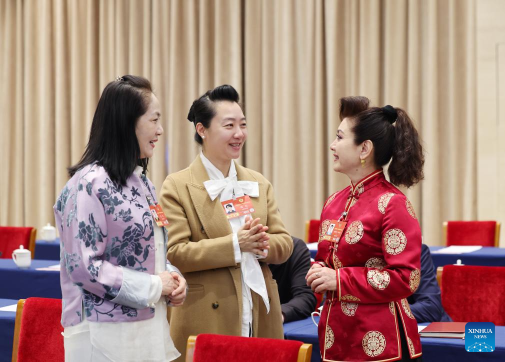 Dilinar Abdulla (R), Zhou Li (C) and Miao Jie, members of the 14th National Committee of the Chinese People's Political Consultative Conference (CPPCC), communicate before a joint group meeting of political advisors from the sectors of literature, the arts and sports at the fourth session of the 14th CPPCC National Committee in Beijing, capital of China, March 6, 2026.