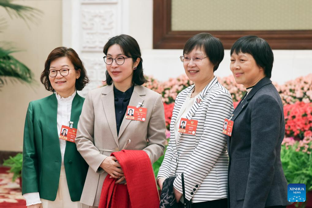 Guo Hongjing (C), a deputy to the 14th National People's Congress (NPC), talks with other lawmakers before a group meeting of deputies from the delegation of Tianjin at the fourth session of the 14th NPC in Beijing, capital of China, March 6, 2026.