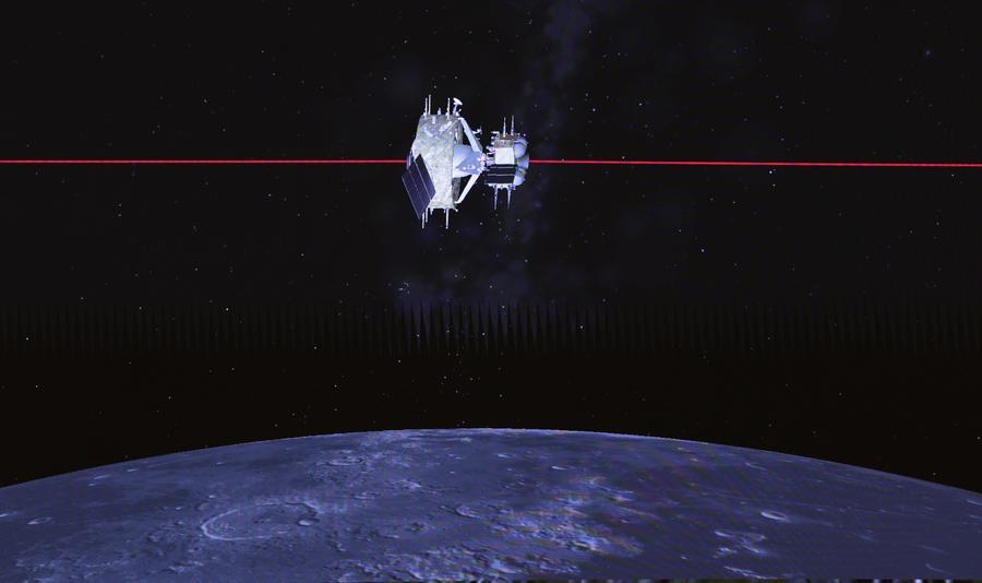 This video animation image displayed at Beijing Aerospace Control Center (BACC) on June 6, 2024 shows the ascender of China's Chang'e-6 probe rendezvousing and docking with the probe's orbiter-returner combination in lunar orbit. (Xinhua/Jin Liwang)