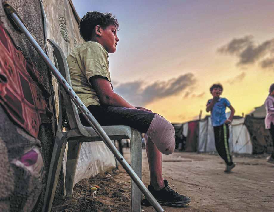 A boy who lost one leg when the school where he had sought refuge during the conflict was hit, studies in a tent in Nuseirat, Gaza, on Tuesday. BELAL ABU AMER/POLARIS