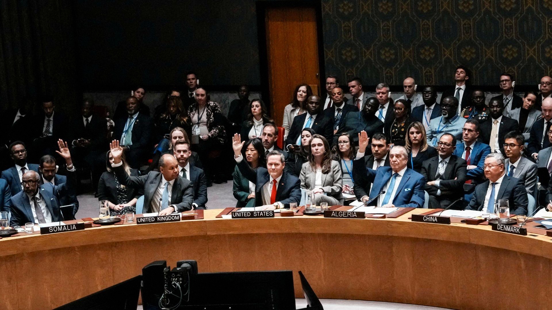 Representatives vote on the resolution during a meeting of the United Nations Security Council to consider a US proposal for a UN mandate to establish an international stabilization force in Gaza.