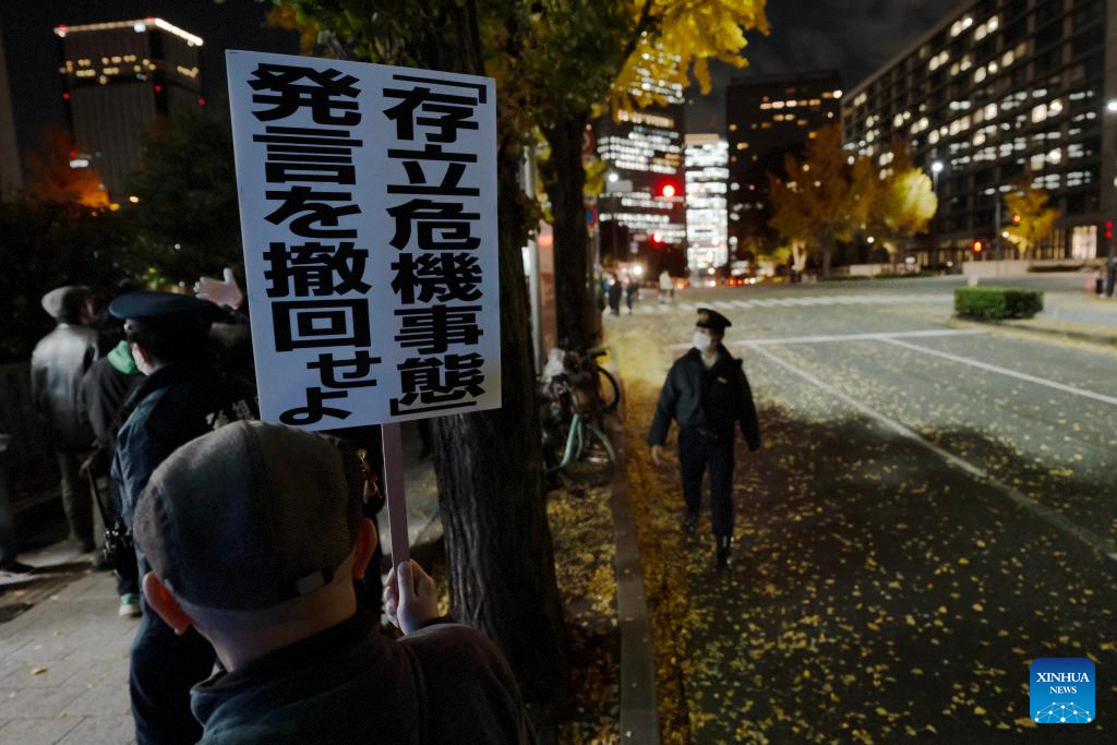 People attend a protest in front of the Japanese prime minister's official residence in Tokyo, Japan, Nov. 28, 2025. In response to Japanese Prime Minister Sanae Takaichi's recent erroneous remarks on China's Taiwan and her continued lack of remorse, Japanese people held another large-scale protest in Tokyo on Friday evening, demanding that Takaichi retract her statements. (Xinhua/Jia Haocheng)