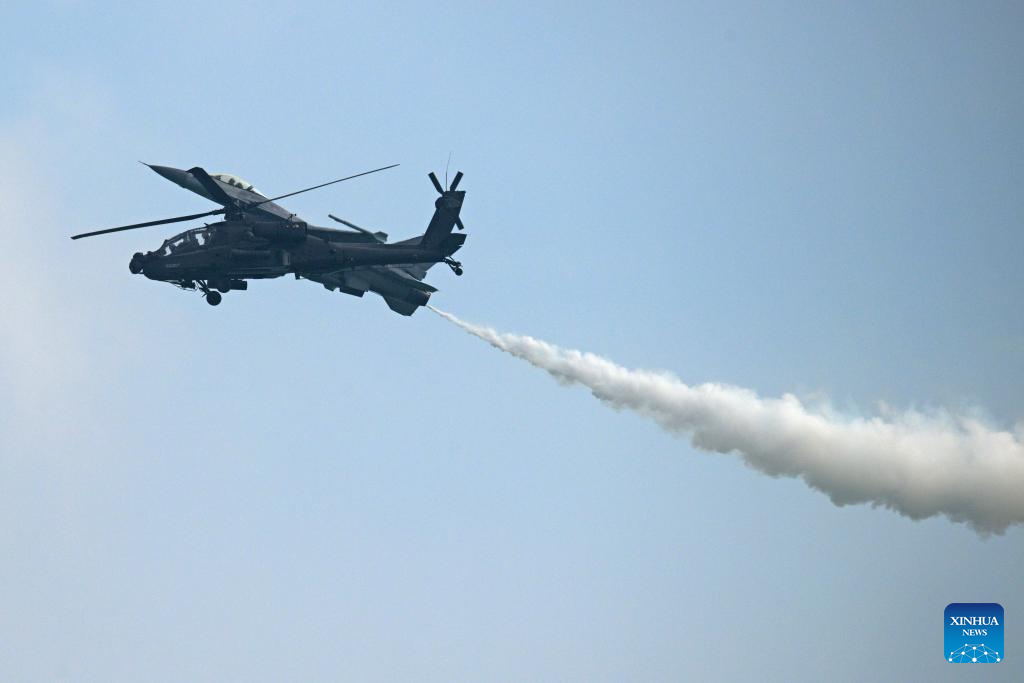 A Republic of Singapore Air Force (RSAF) AH-64D Apache helicopter (front) and a F-16C fighter jet perform during the media preview for the 10th Singapore Airshow in Singapore, Feb. 1, 2026. The airshow will be held from Feb. 3 to 8 in Singapore. (Photo by Then Chih Wey/Xinhua)