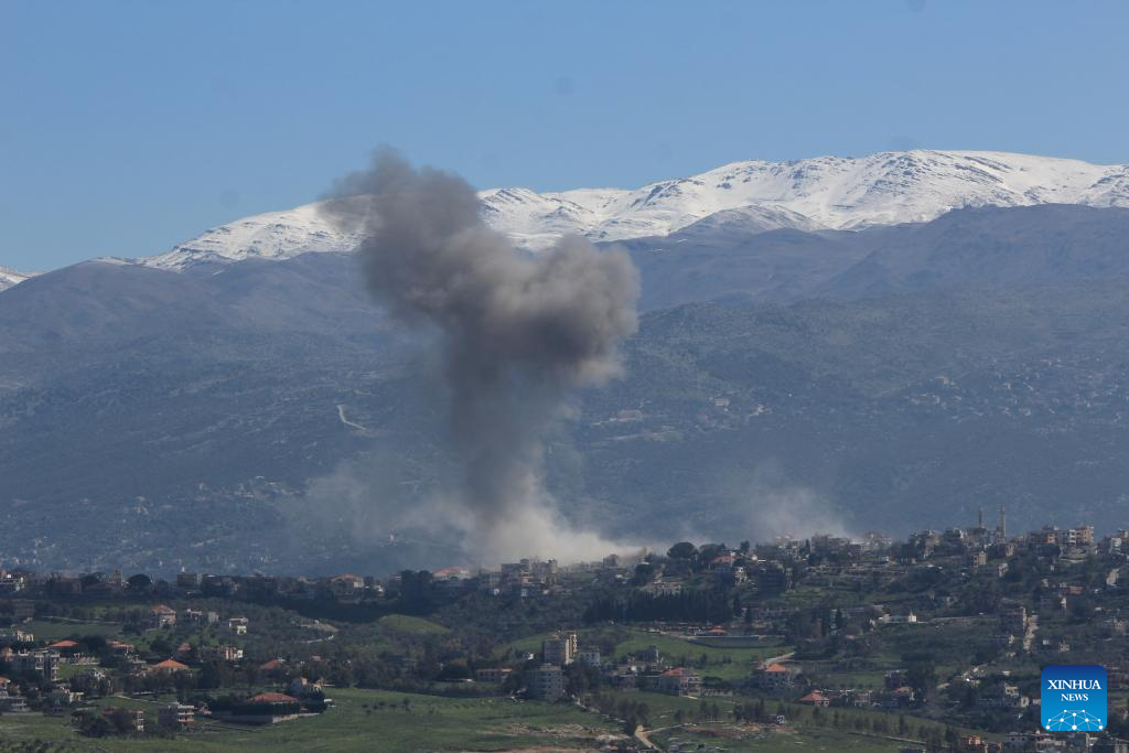 This photo taken on March 17, 2026 shows smoke rising from the site of an Israeli airstrike in Khiam, Lebanon. (Photo by Taher Abu Hamdan/Xinhua)