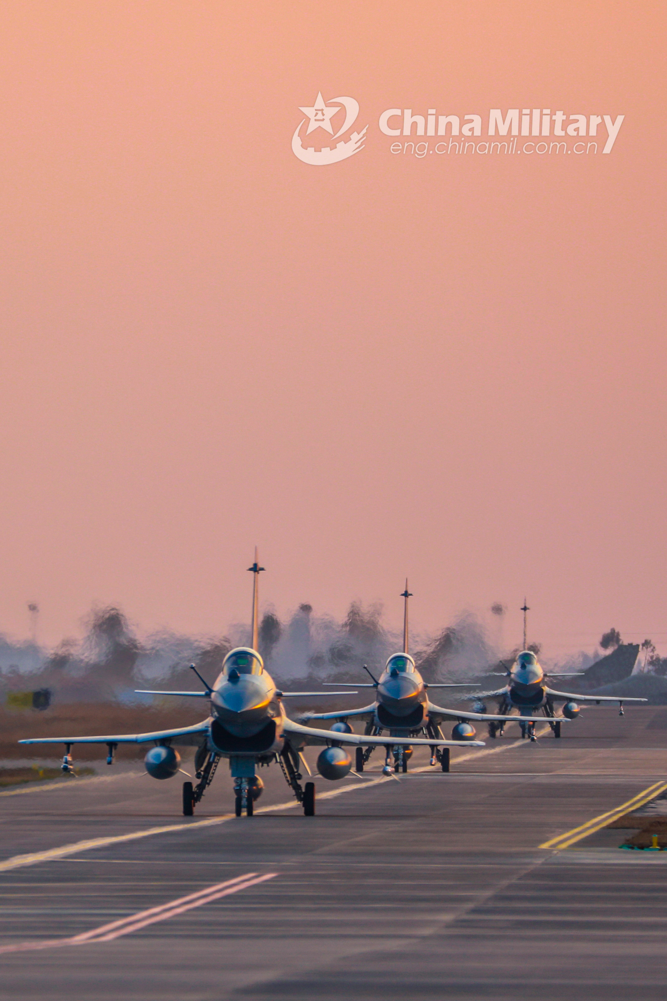 Three J-10 fighter jets attached to an aviation brigade of the air force under the PLA Southern Theater Command taxi on the flight line in close formation during a day-into-night flight training exercise on February 2, 2021. The exercise is focused on training items like tactical formation flight, simulated aerial combat, etc. (eng.chinamil.com.cn/photo by Wang Guoyun )