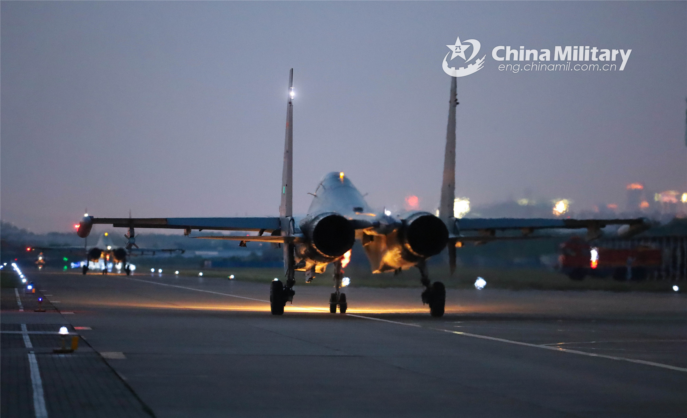 Fighter jets attached to an aviation brigade of the air force under the PLA Southern Theater Command taxi on the runway in formation before takeoff during an air combat training exercise on April 27, 2022. (eng.chinamil.com.cn/Photo by Lu Shiqiang)