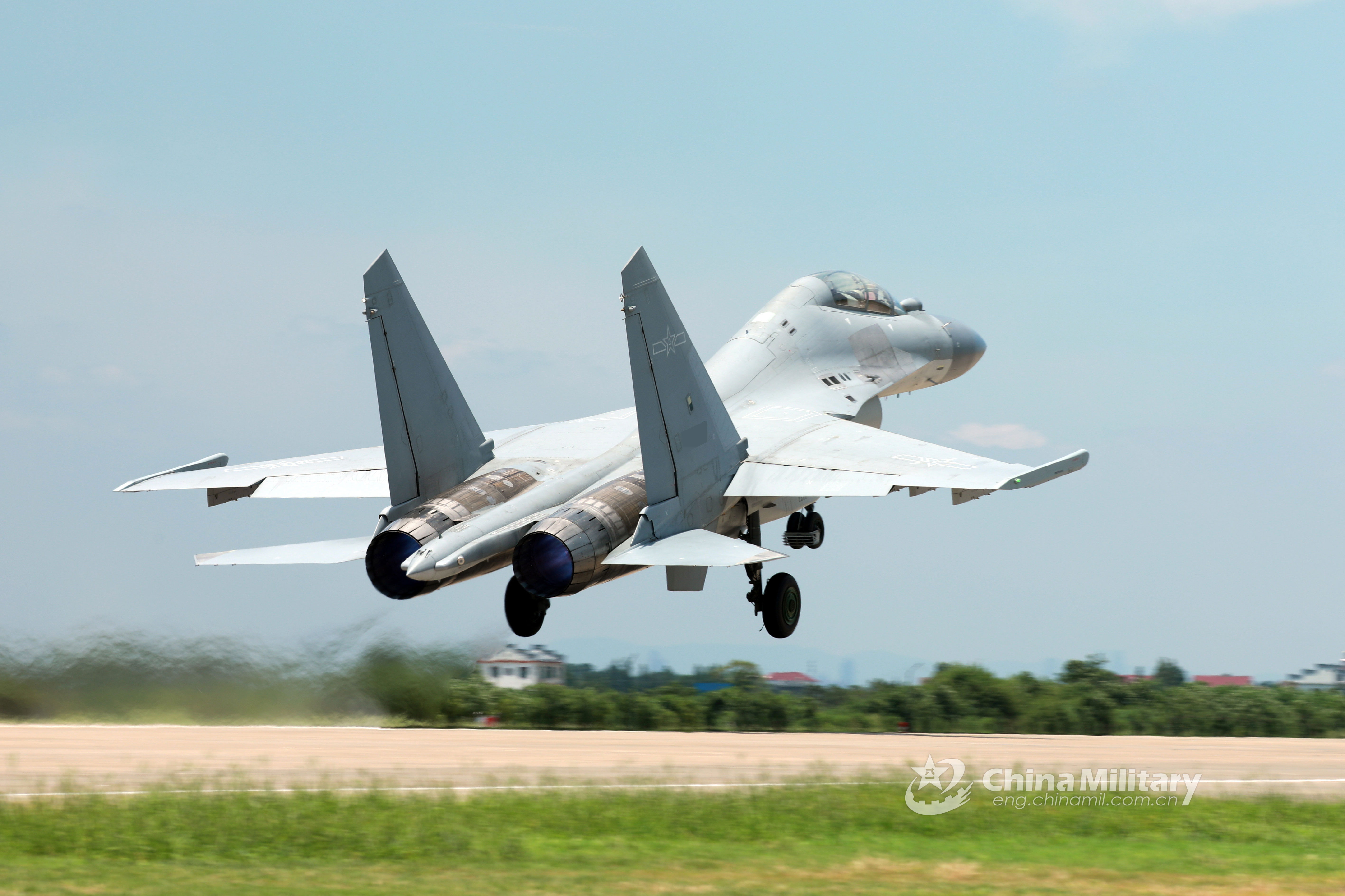 A J-16 fighter jet attached to an aviation brigade of the air force under the PLA Eastern Theater Command takes off for a flight training exercise on July 17, 2018. (eng.chinamil.com.cn/Photo by Wang Yijie)