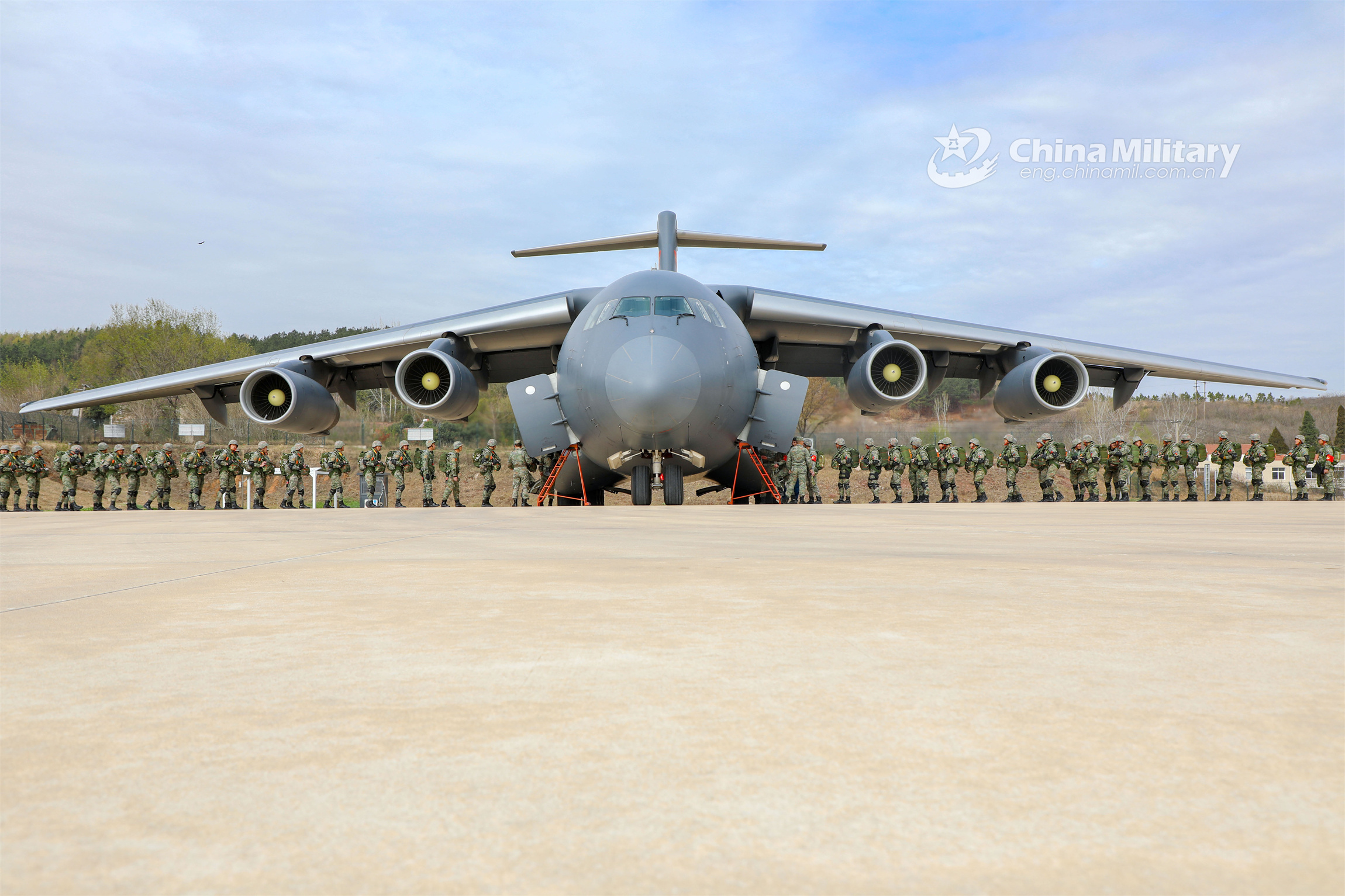 Airmen assigned to an airborne brigade of the PLA Air Force line up for boarding a transport plane during a parachuting training exercise on March 25, 2023. (eng.chinamil.com.cn/Photo by Zhu Haitao)