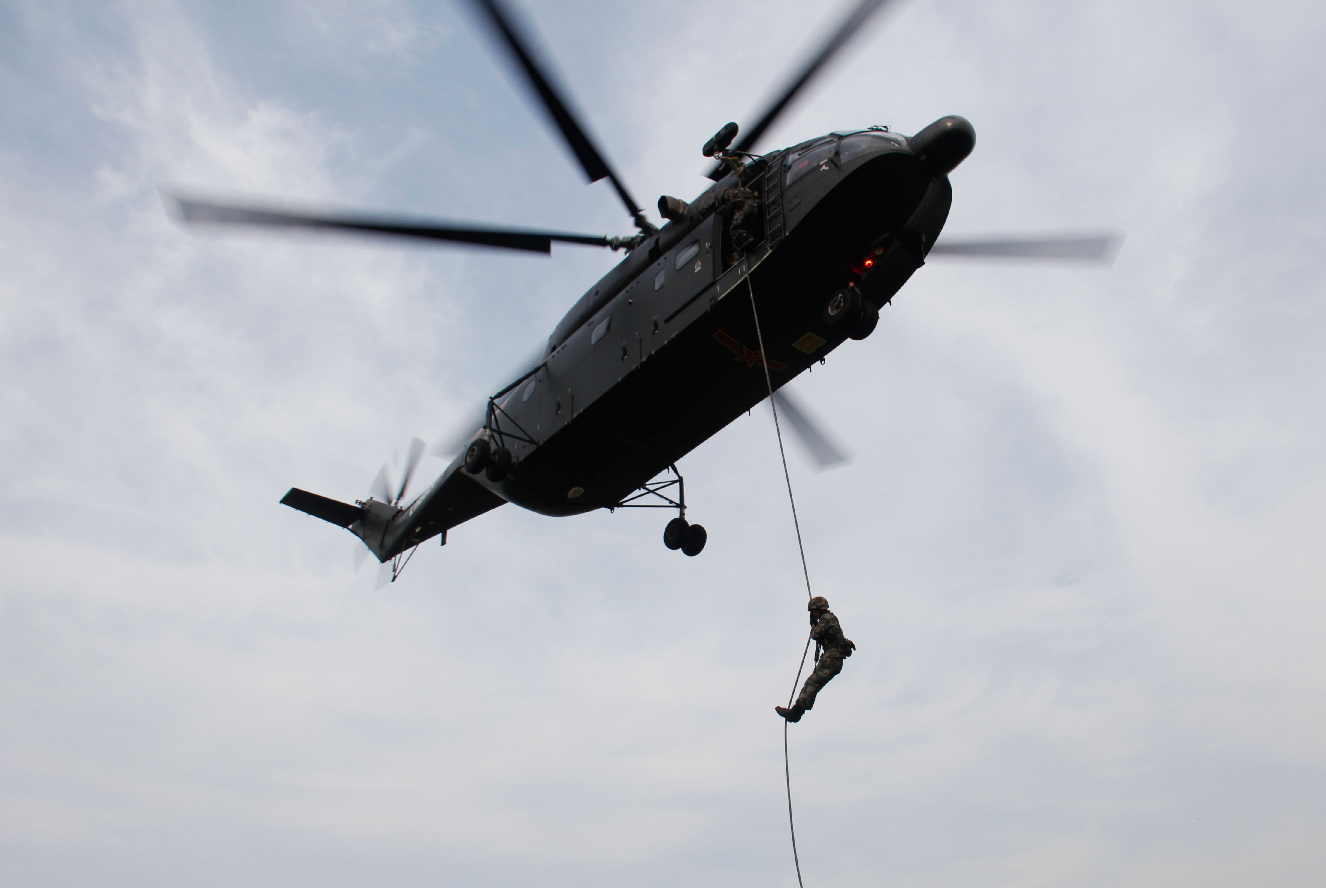 A special operations soldier assigned to an air assault brigade under the PLA 75th Group Army fast-ropes from a Z-8 transport helicopter during a fast-roping training exercise on April 19, 2018. (eng.chinamil.com.cn/Photo by Zhang Zhengju)