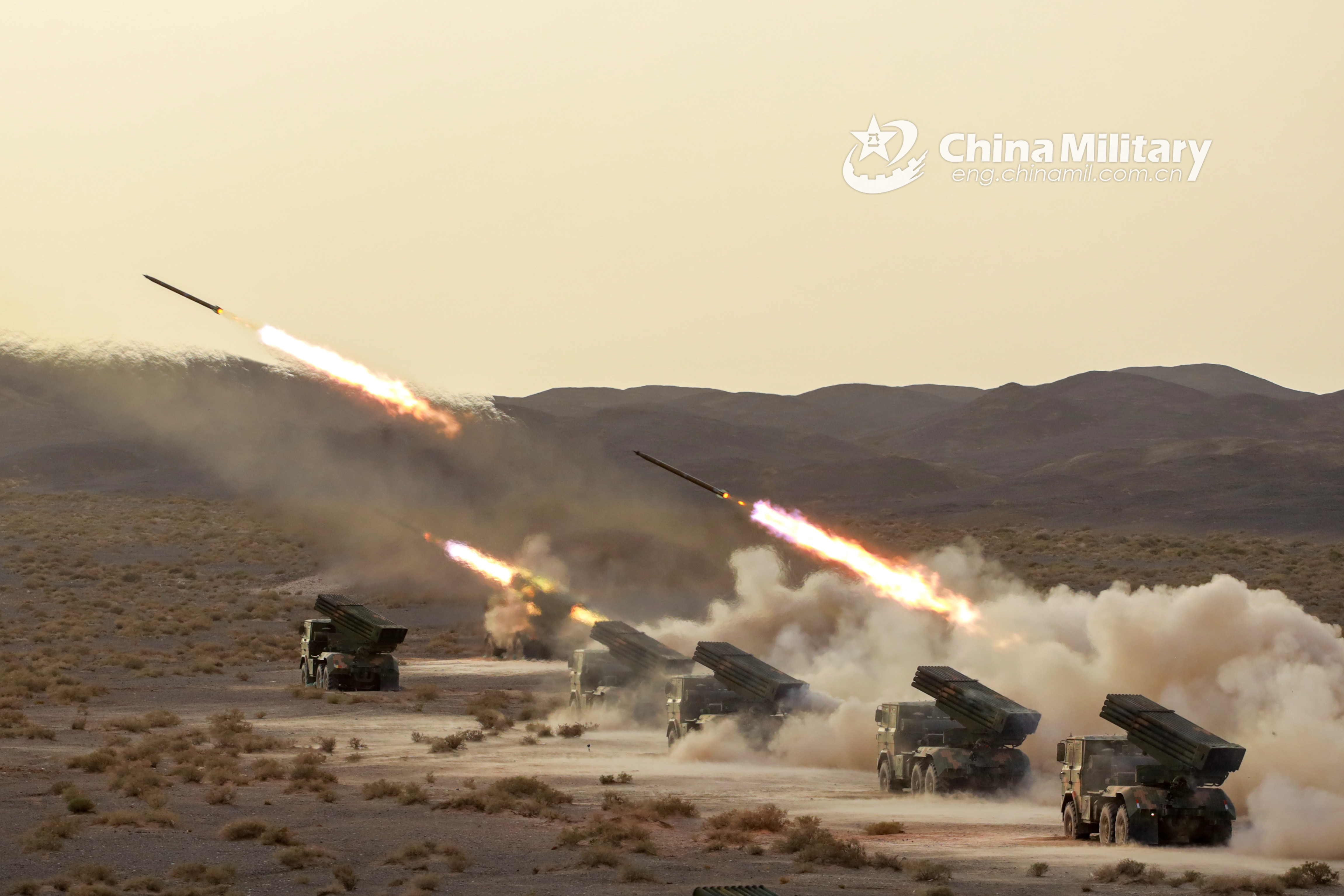 Long-range multiple launch rocket systems (LRMLRS) attached to an artillery detachment of a brigade under the PLA 73rd Group Army fire rockets during a live-fire training exercise in northwestern China’s Gobi Desert on June 21, 2021. (eng.chinamil.com.cn/Photo by Ma Zhuang)