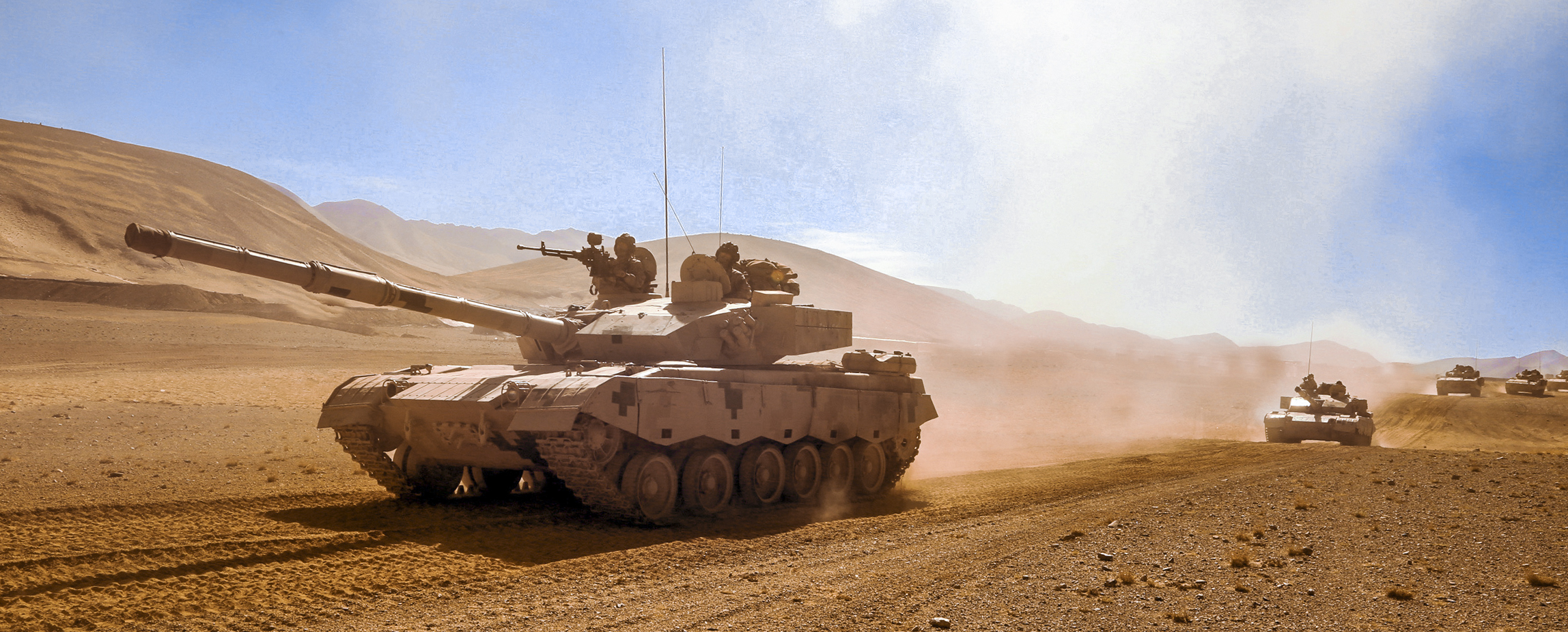 Main battle tanks attached to a brigade under the PLA 77th Group Army kick up plumes of dust as they move forward to the designated base during a maneuver operation in desert on June 7, 2023. (eng.chinamil.com.cn/Photo by Peng Jiazheng)
